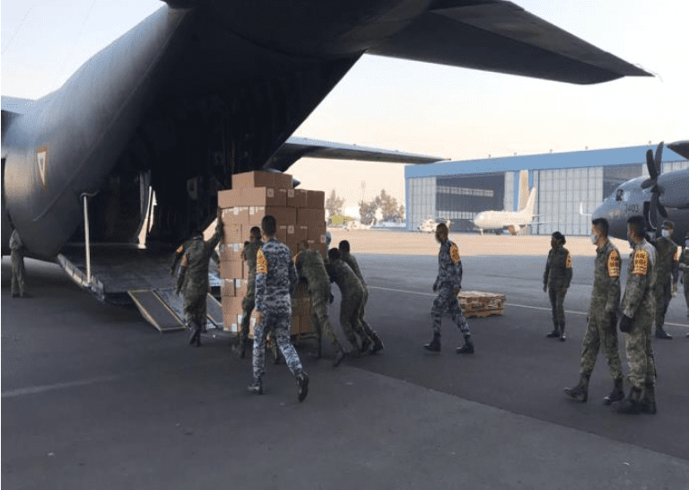 país, esta fecha a las 13:20 horas, despegó de la ciudad de México un avión “Hércules” C-130 Matrícula 3616 de la Fuerza Aérea Mexicana, con destino al Aeropuerto Internacional de Cancún, Q. Roo, con el fin de trasladar 16 toneladas de insumos, medicamento, mobiliario y equipo de protección personal.