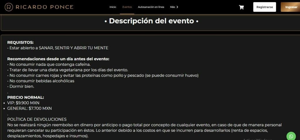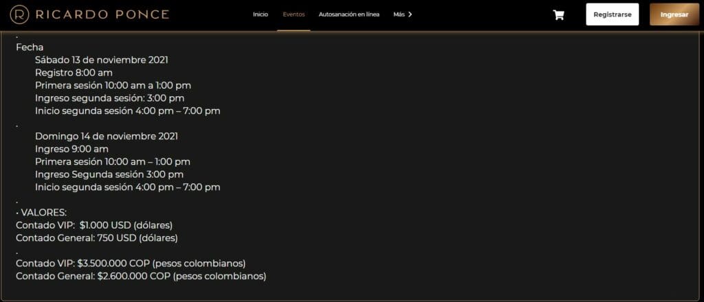 En su página oficial, el “coach”, ofrece terapias en Colombia, el 13 y 14 de noviembre y los precios son de 1000 dólares VIP y 750 dólares. En la Ciudad de México está anunciado que será el próximo 5 de diciembre en dos horarios con un costo de 9,900 pesos VIP y general, 7,700 pesos.