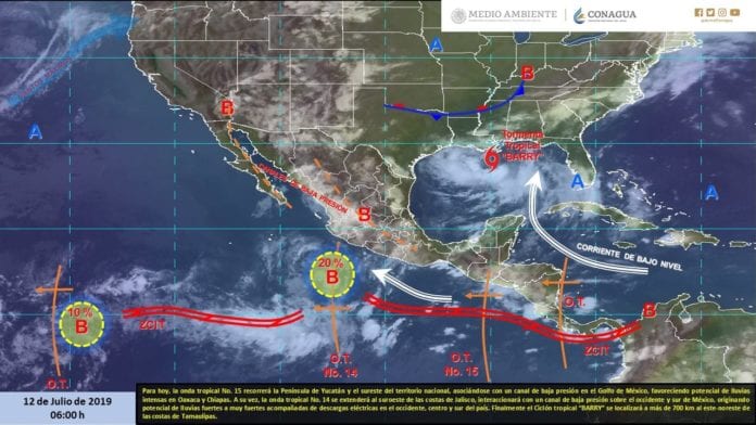 Por otra parte, la tormenta “Barry” se encontraba esta mañana a unos 730 kilómetros de Matamoros, Tamaulipas, y aunque no representa riesgo para el país, sus efectos, en particular sus bandas de nublados de circulación ciclónica están cruzando sobre la península de Yucatán, reforzando el potencial de lluvias con intervalos de chubascos en los tres estados peninsulares.