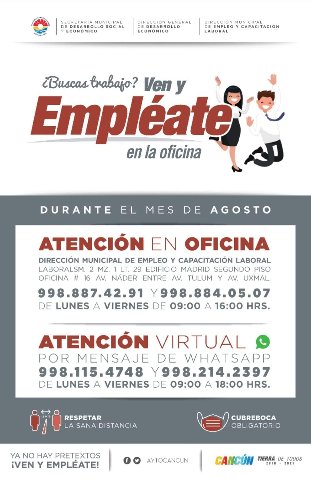 Como ya decíamos, debido a la pandemia, puedes contactar a la gente por medio de WhatsApp para ser atendido al momento de buscar un trabajo, lo cual están haciendo muchos cancunenses debido a la emergencia sanitaria. Aquí tienes los dos números para contactar al personal y que se te brinde atención personalizada y a distancia.
