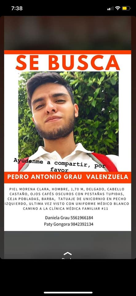 Playa del Carmen, Quintana Roo.-Familiares del Médico internista del IMSS en Playa del Carmen, Pedro Antonio Grau Valenzuela, viajaron de Oaxaca para buscar al joven de 22 años de edad, quien se dirigía a la Unidad Médica Familiar No 11 a trabajar y desapareció sin que hasta el momento se sepa de él.