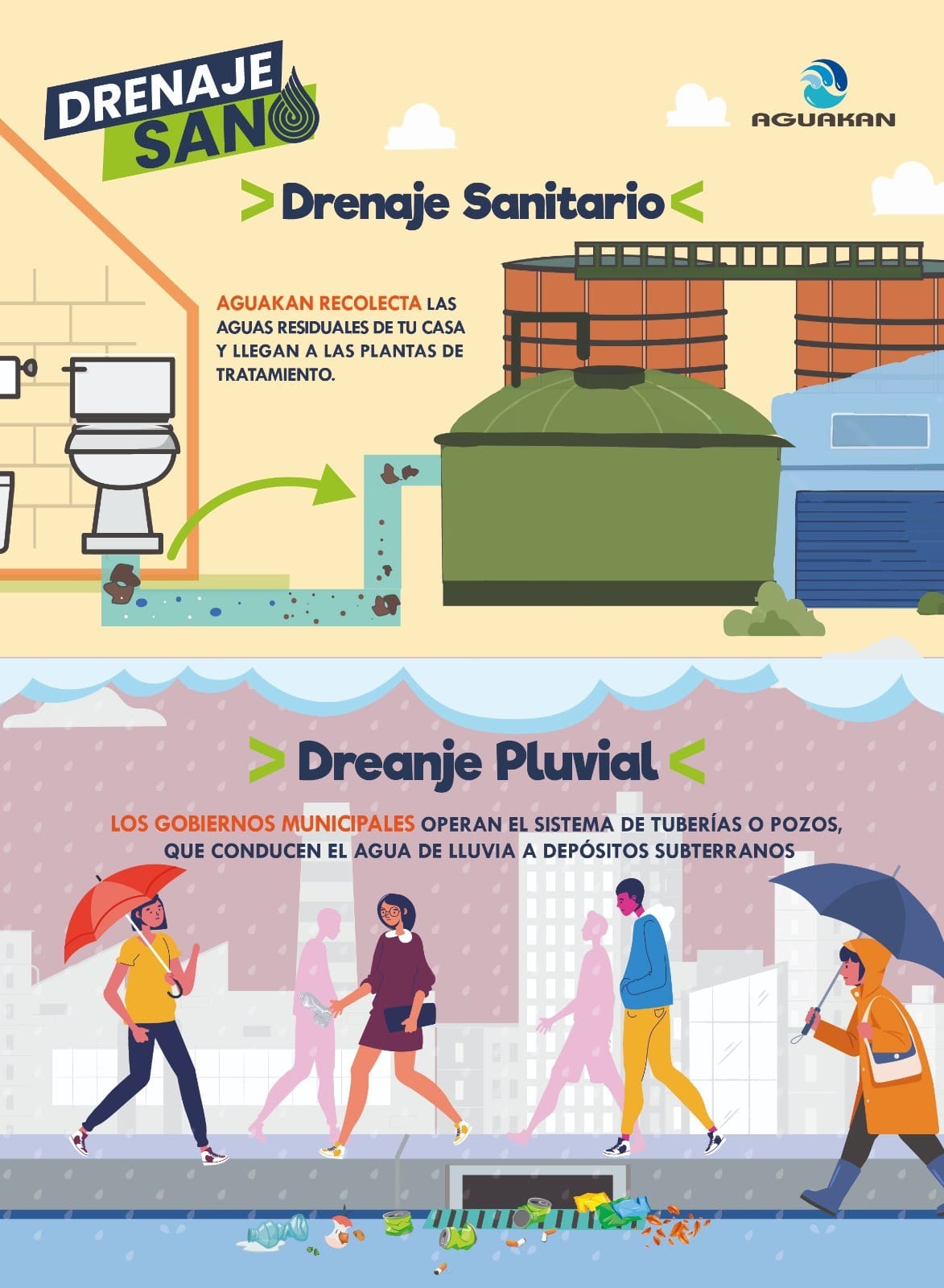 Por otra parte, el drenaje sanitario, que conduce aguas residuales hacia plantas de tratamiento, protegiendo la salud y evitando la contaminación, del cual es responsable Aguakan. Aunque son distintos, ambos sistemas comparten un mismo objetivo: garantizar ciudades seguras y comunidades saludables.