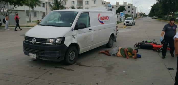 Playa del Carmen.- Un sujeto que conducía una motocicleta fue arrollado por el conductor de una camioneta de una empresa de paquetería que no respetó el alto marcado. El motociclista terminó con varias lesiones, algunas de consideración. Pese a ello ambos llegaron a un arreglo en el lugar.