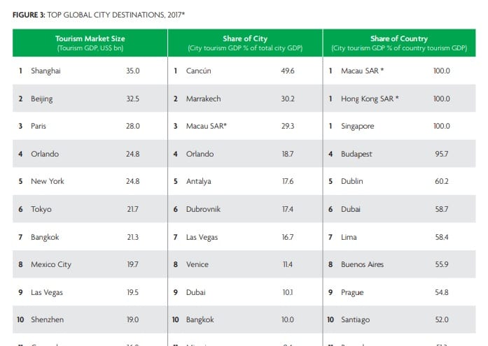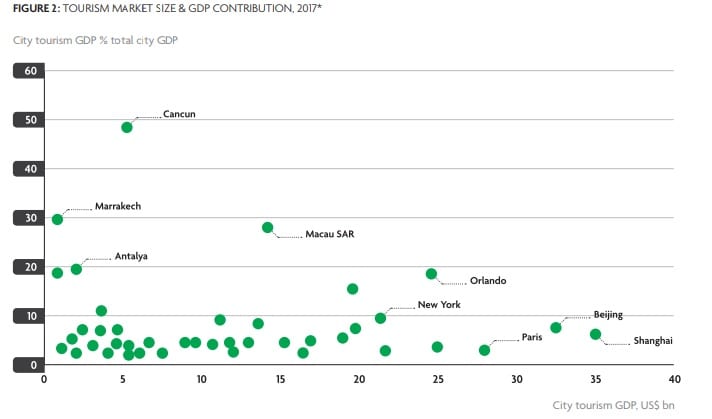 En un ranking de estas ciudades por el porcentaje de su Producto Interno Bruto (PIB) que deriva del turismo, Cancún se ubica muy lejos a la cabeza, con un 49.6%; la ciudad que le sigue, Marrakech, cuenta con un 30.2%, en tanto que Macao suma un 29.3%. La Ciudad de México se ubica en el número 15, con un 7.5% de sus recursos provenientes del turismo.