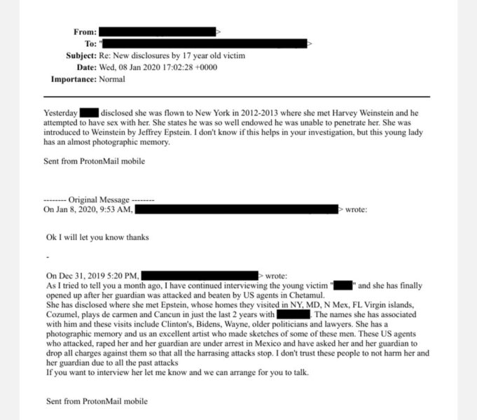 En otros mails del 2017, se habla de una víctima que decía que hacía tenido contacto con diversos personajes como Harvey Weinstein, Bill Clinton, Joe Biden y demás. Y que había estado tanto en Estados Unidos como en algunos de los destinos de Quintana Roo como Cancún, Playa del Carmen y Cozumel.