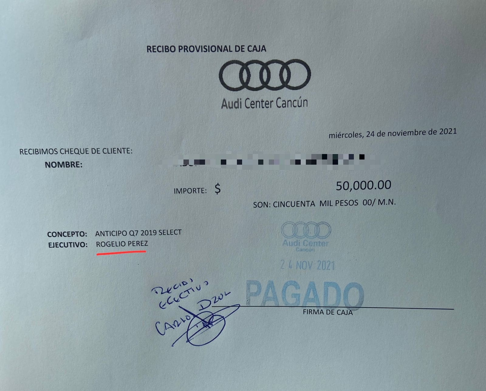 Clientes de Audi Cancún exhiben como dicha agencia automotriz jinetea su dinero. Un comprador tenía contemplado adquirir una camioneta de 850 mil pesos, dando un anticipo el 24 de noviembre por el orden de 50 mil pesos.