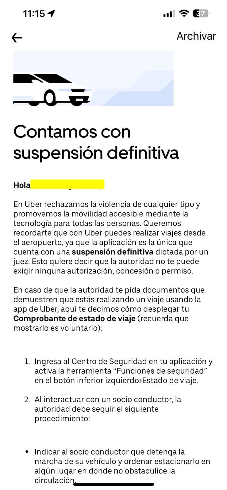“Derivado de un juicio de amparo, Uber cuenta con una suspensión definitiva que permite a los socios conductores registrados en la aplicación, realizar viajes desde cualquier aeropuerto del país, sin la necesidadde la obtención de un permiso. Cualquier detención o retención de vehículos debe considerarse ilegal conforme a lo establecido por dicha suspensión”, señaló la empresa por medio de un breve comunicado.