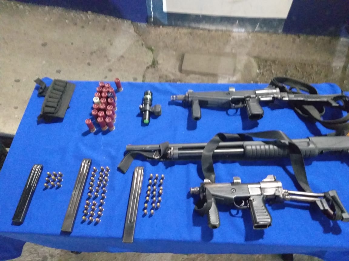 Lo asegurado quedó a disposición de la autoridad y fueron: dos Armas largas tipo escopeta Escort; 21 Cartuchos; un Arma corta tipo Austra 1.380 VFNA008 con 02 Cargadores con 30 Cartuchos de 9mm; un Arma larga tipo Mendoza 02448 Cobra 1.380; un Arma larga tipo Mendoza 006602 Pat.Num 835; tres Cargadores con 09, 20, 30 cartuchos de 9mm; seis chalecos Tácticos y un Chaleco Balístico.