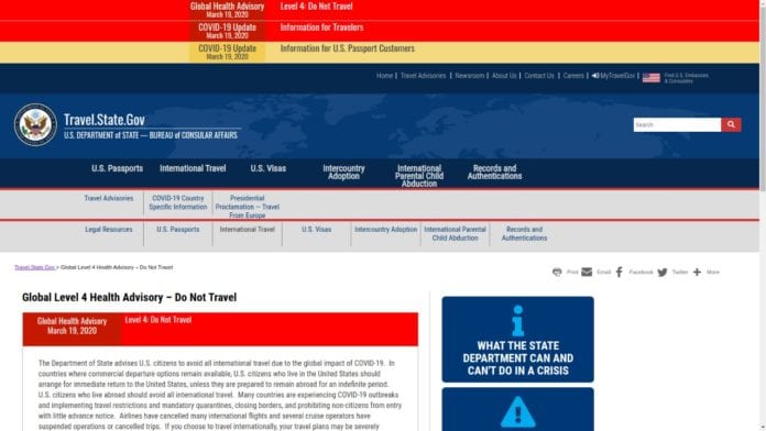 Cancún.- El Departamento de Estado de los Estados Unidos elevó al nivel máximo su recomendación global a viajeros, ante la pandemia del coronavirus Covid-19, al pasarla de “reconsidere viajar” a “no viajar.