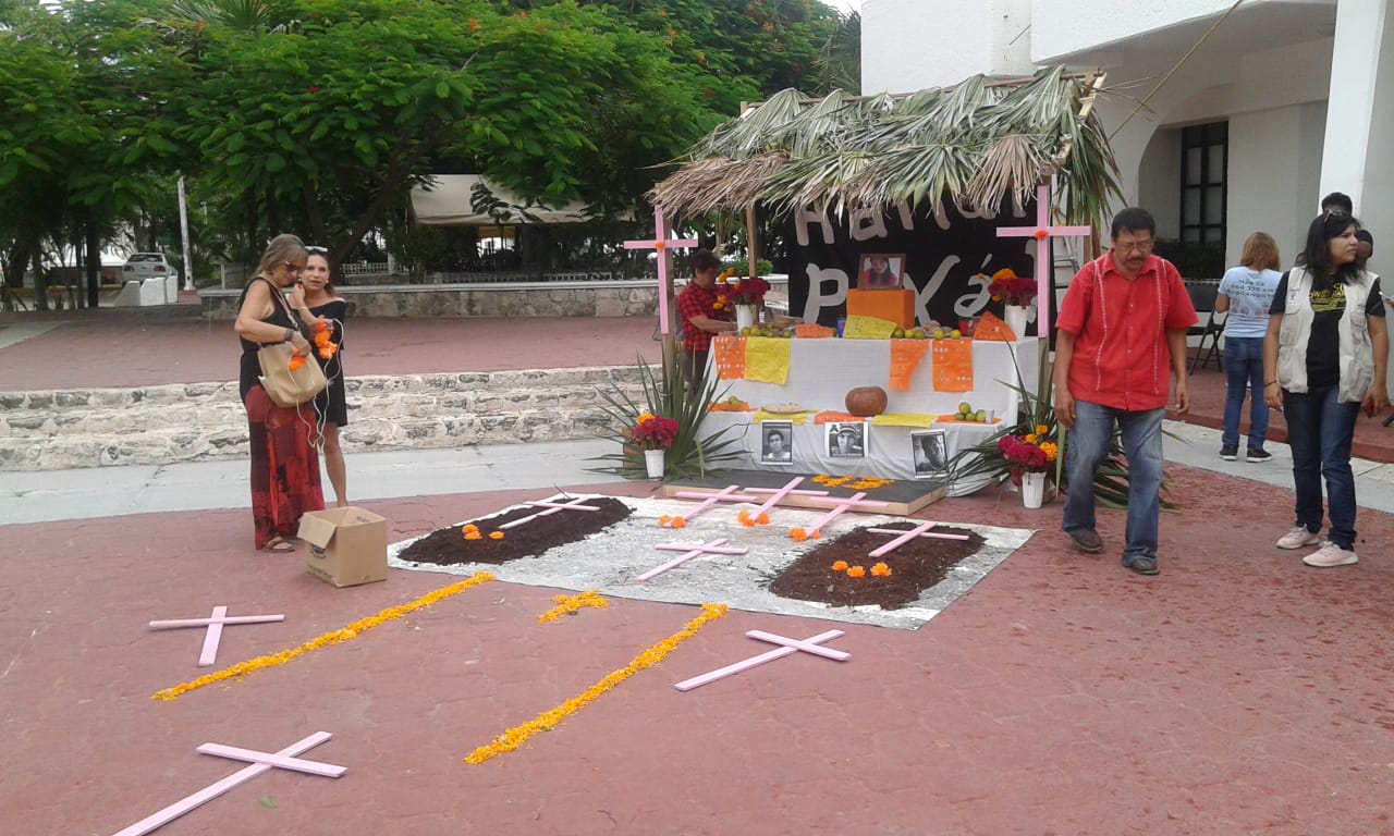 Cancún.- Las celebraciones como el Día de Muertos también permiten recordar a las víctimas de violencia, en este caso de género. Por ello es que diversas asociaciones civiles pusieron un altar a manera de protesta, para exigir que cesen los feminicidios y que se castigue a los culpables de estos crímenes de odio.