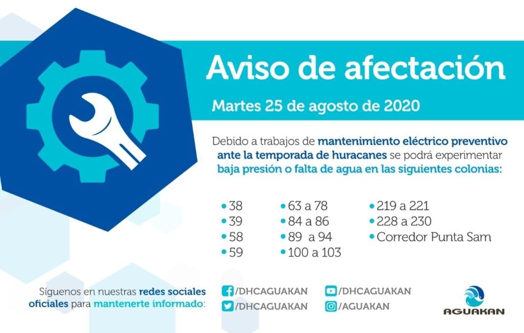 Ante la actual temporada de huracanes que inició el pasado mes de julio y con duración hasta el mes de noviembre, Aguakan pondrá en marcha el próximo martes 25 de agosto un programa de mantenimiento eléctrico preventivo a la infraestructura hidráulica del municipio de Benito Juárez, con el objetivo de mejorar el rendimiento en los equipos en la zona de captación, por lo que el suministro de agua potable podría verse afectado.