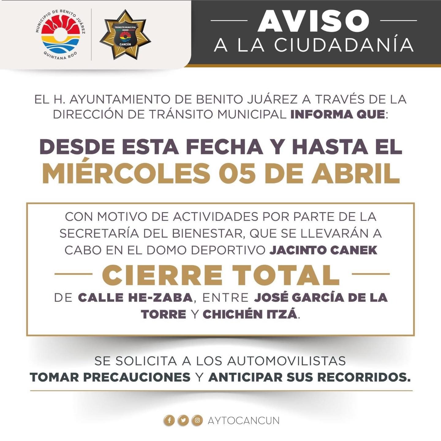 De acuerdo con lo que el Ayuntamiento de Benito Juárez ha informado por medio de sus redes sociales, será la calle He-Zaba la que se mantendrá cerrada, a fin de garantizar la seguridad de las personas que acudirán durante estos días a recoger su tarjeta del programa “Mujer es Vida”.