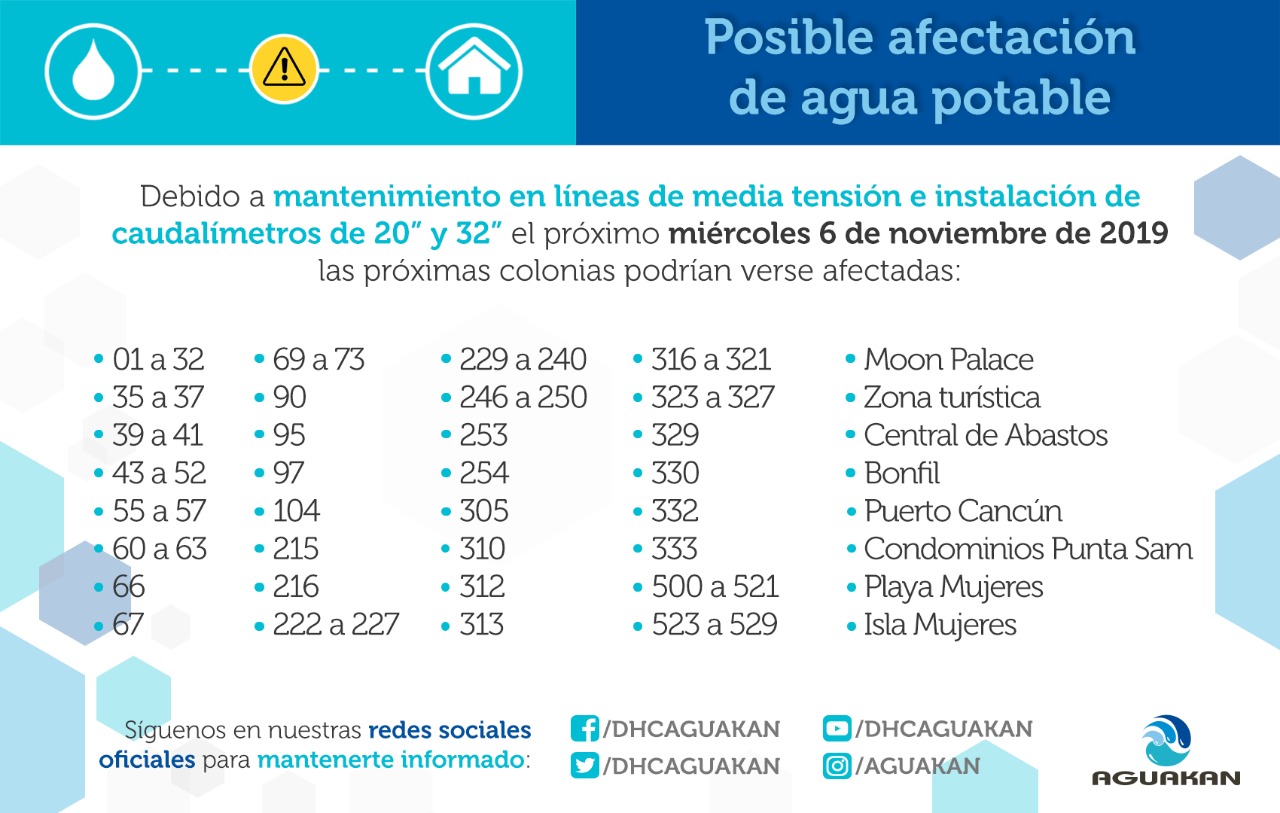Por lo anterior, podría experimentarse falta de agua en las supermanzanas 01 a 32, 35 a 37, 39 a 41, 43 a 52, 55 a 57, 60 a 63, 66, 67, 69 a 73, 90, 95, 97, 104, 215, 216, 222 a 227, 229 a 240, 246 a 250, 253, 254, 305, 310, 312, 313, 316 a 321, 323 a 327, 329, 330, 332, 333, 500 a 521, 523 a 529, Moon Palace, Zona turística, Central de Abastos, Alfredo Bonfil, Puerto Cancún, Condominios Punta Sam, Playa Mujeres e Isla Mujeres.
