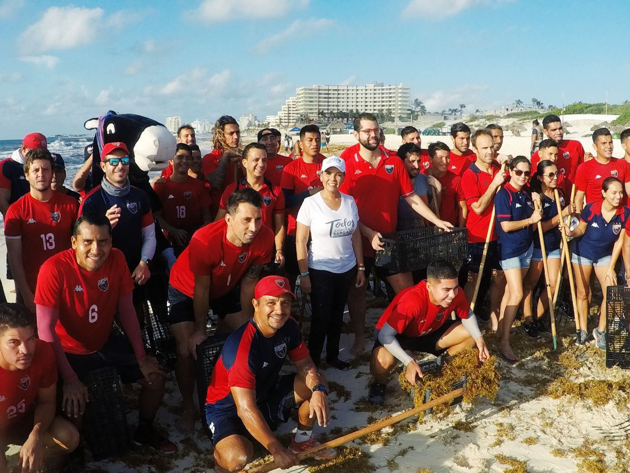 En esta ocasión, jugadores, directiva y cuerpo técnico del Club de Futbol Atlante, así como benitojuarenses, autoridades y trabajadores municipales, acompañaron a la presidente municipal de Benito Juárez, Mara Lezama Espinosa, para “ponerse las pilas” y retirar sargazo en Playa Delfines.