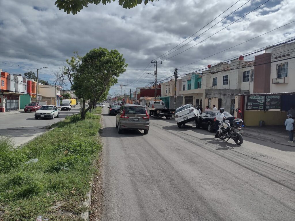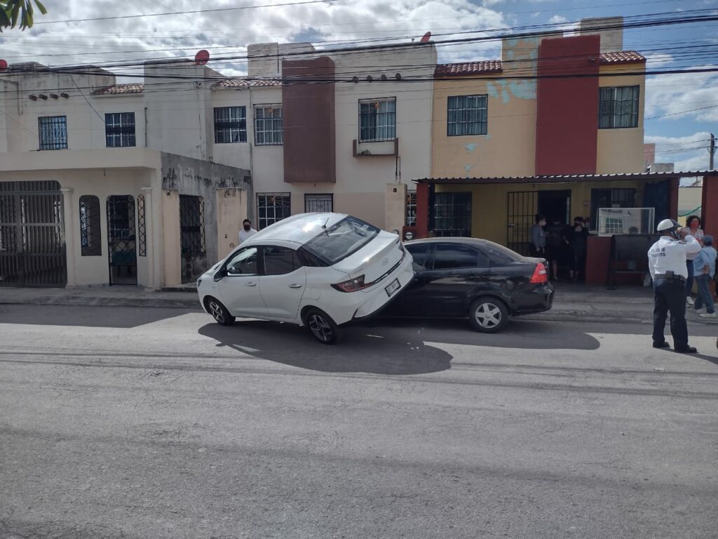 Al avanzar por la Kabah, entre Tules y el Periférico, este conductor al parecer perdió el control, al grado de chocar contra un coche estacionado, un Aveo negro, con el que terminó aplastando con su neumático delantero derecho.
