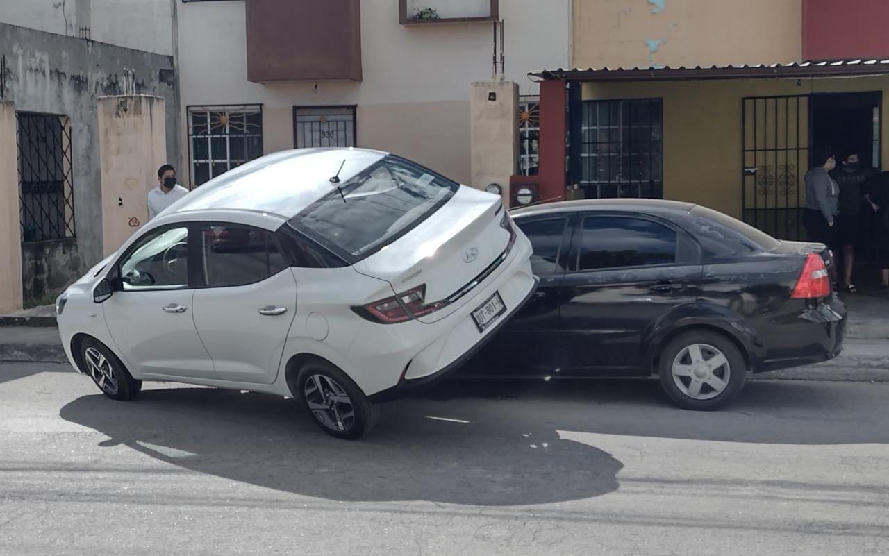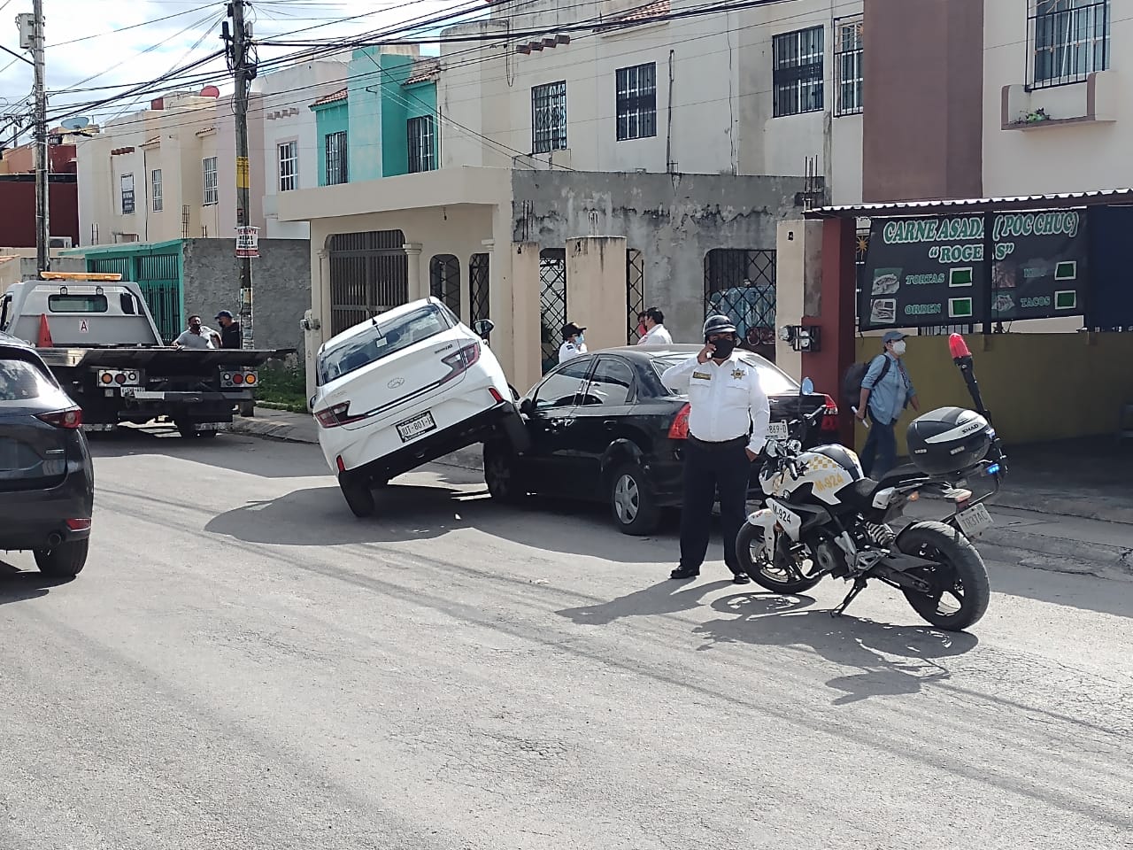 Cancún.- Un automovilista que conducía de manera desprevenida se estrelló esta tarde contra un coche estacionado, sobre el que quedó parcialmente montado, en la lateral de la avenida Kabah, casi esquina con la sexta privada del fraccionamiento Villas del Mar.