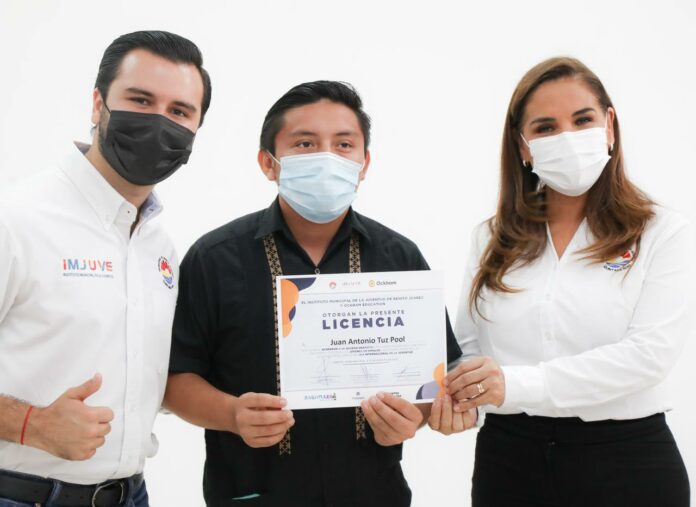 La Presidenta Municipal Mara Lezama entregó de manera simbólica 10 licencias a igual número de jóvenes que aprovecharán el curso “Programación Básica” por parte de Ockham Education, a través del Instituto Municipal de la Juventud (IMJUVE), que tiene una duración de 6 horas y media en una modalidad en línea.