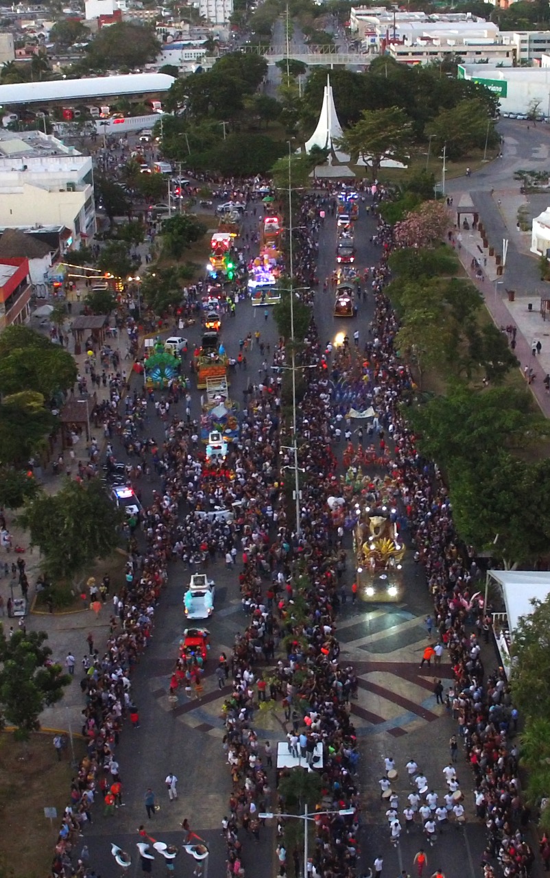 Destacando en el centro de la caravana, por sus estructura de pirámides, grandes esculturas de cuatro jaguares y en medio la cabeza de este animal nativo, el carro alegórico de los Reyes de la Discapacidad, liderado por el carro alegórico y comparsa de payasos y zanqueros de Charly, seguidos por alumnos del Colegio Bachilleres I, la colorida comparsa tradicional “Mayapax” y la comparsa “Brisa Marina”.