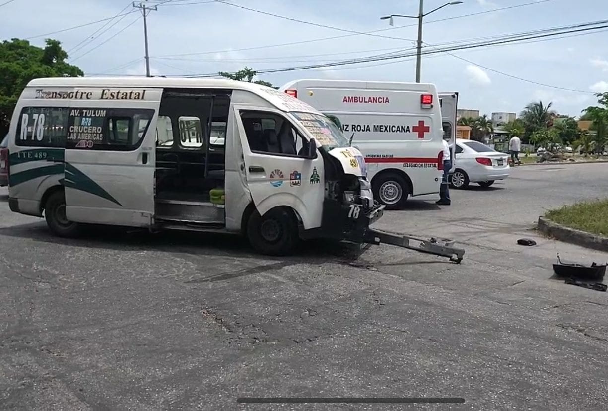 Cancún.- Este mañana, una combi de transporte público de la Ruta 78 y una camioneta protagonizaron un aparatoso choque que dejó como saldo 11 lesionados, entre los que se encuentran una mujer embarazada de 6 meses, esto en la avenida Leona Vicario de Cancún.