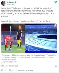 En lugar de mostrar a Sian Massey-Ellis, considerada una de las mejores árbitros asistentes de fútbol, la televisión iraní presentaba tomas del estadio del Tottenham, en Londres, y sus alrededores.