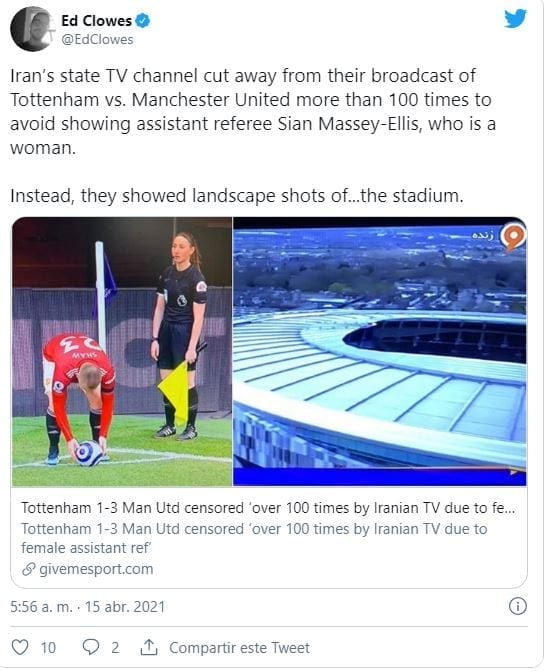 Un canal de la televisión estatal de Irán interrumpió más de 100 veces la transmisión del partido de la Premier League inglesa entre el Tottenham Hotspur y Manchester United (1-3), para evitar exponer las piernas desnudas de la juez de línea que integraba la terna arbitral del encuentro disputado el pasado fin de semana, informa Daily Mail.