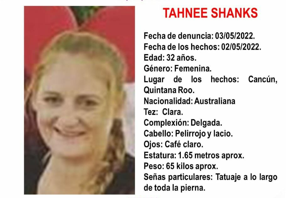 Cancún. – El caso de Tahnee Shanks, de 32 años de edad y originaria de Australia, quien lleva desaparecida cinco días en Quintana Roo, ya llegó hasta su país, debido a las extrañas circunstancias en las que han ocurrido los hechos.