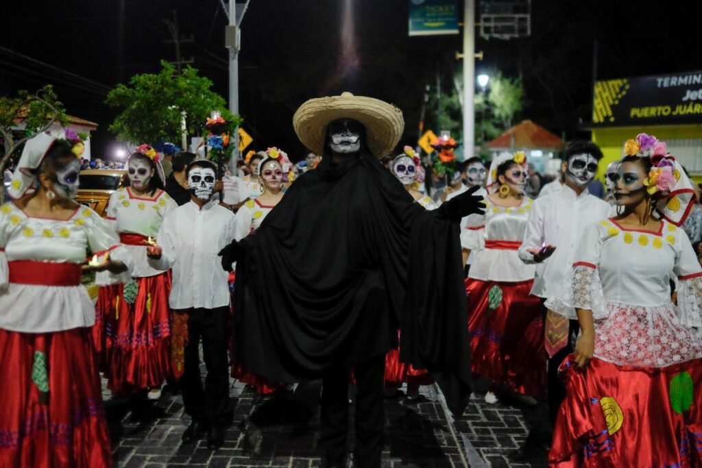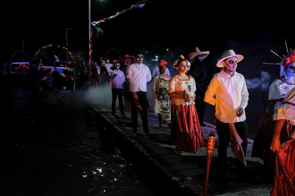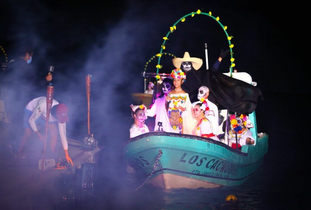 La celebración de la vida y muerte, dentro de la concepción maya, inició con el desembarque de 13 lanchas y una procesión de catrinas que representan a las ánimas, quienes trajeron consigo el caracol y copal que simbolizan el mar que se une con la tierra y la purificación del aire para que las ánimas tengan un tránsito agradable.
