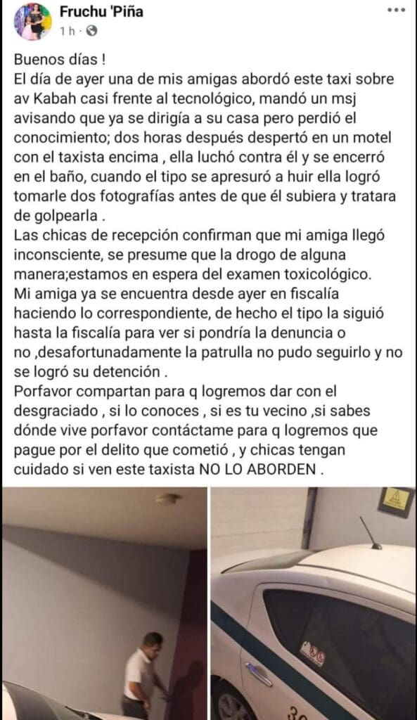 “Por favor, compartan para que logremos dar con el desgraciado, si lo conoces, si es tu vecino, si sabes dónde vive, por favor contáctame para que logremos que pague por el delito que cometió. Y chicas: tengan cuidado si ven este taxista no lo aborden”, recomendó la amiga de la víctima a las mujeres de Cancún.