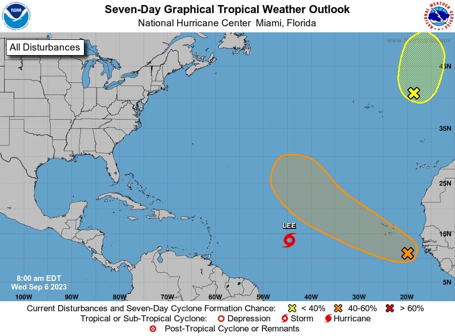 También se vigila una zona de baja presión cerca de la costa occidental de África, asociada a una onda tropical, que mantiene 30 por ciento su probabilidad para desarrollo ciclónico en 48 hrs y disminuye a 60 por ciento en siete días. Por ahora se localiza a unos 7 mil 389 kilómetros al este de la entidad y se desplaza hacia el oeste-noroeste a 16 y 24 kilómetros por hora.