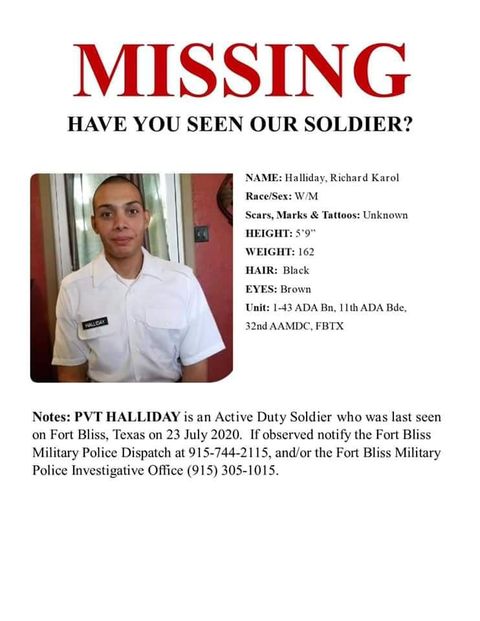 Richard Halliday es un soldado de 21 años perteneciente a la base militar de Fort Bliss, en el estado de Texas, Estados Unidos, y que desde el pasado 24 de julio está desaparecido; por lo que sus familiares han acudido a todas las dependencias pertinentes para poder encontrarlo.