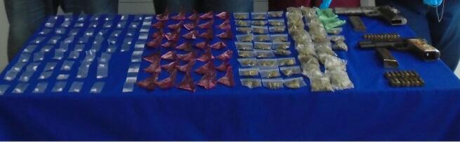 Se les encontró dos armas de fuego, calibre 45, así como decenas de dosis de drogas como cristal, piedra, cocaína y marihuana.