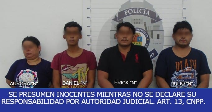 Se trata de tres hombres y una mujer que responden a los nombres:Aurora “N”, de 32 años de edad; Daniel “N”, de 27 años de edad; Erick “N”, de 26 años y Julio Iván “N” de 28 años. Este último se presume fue cómplice en el homicidio de un policía, al ser quien manejaba la motocicleta en la que se fugó el asesino.