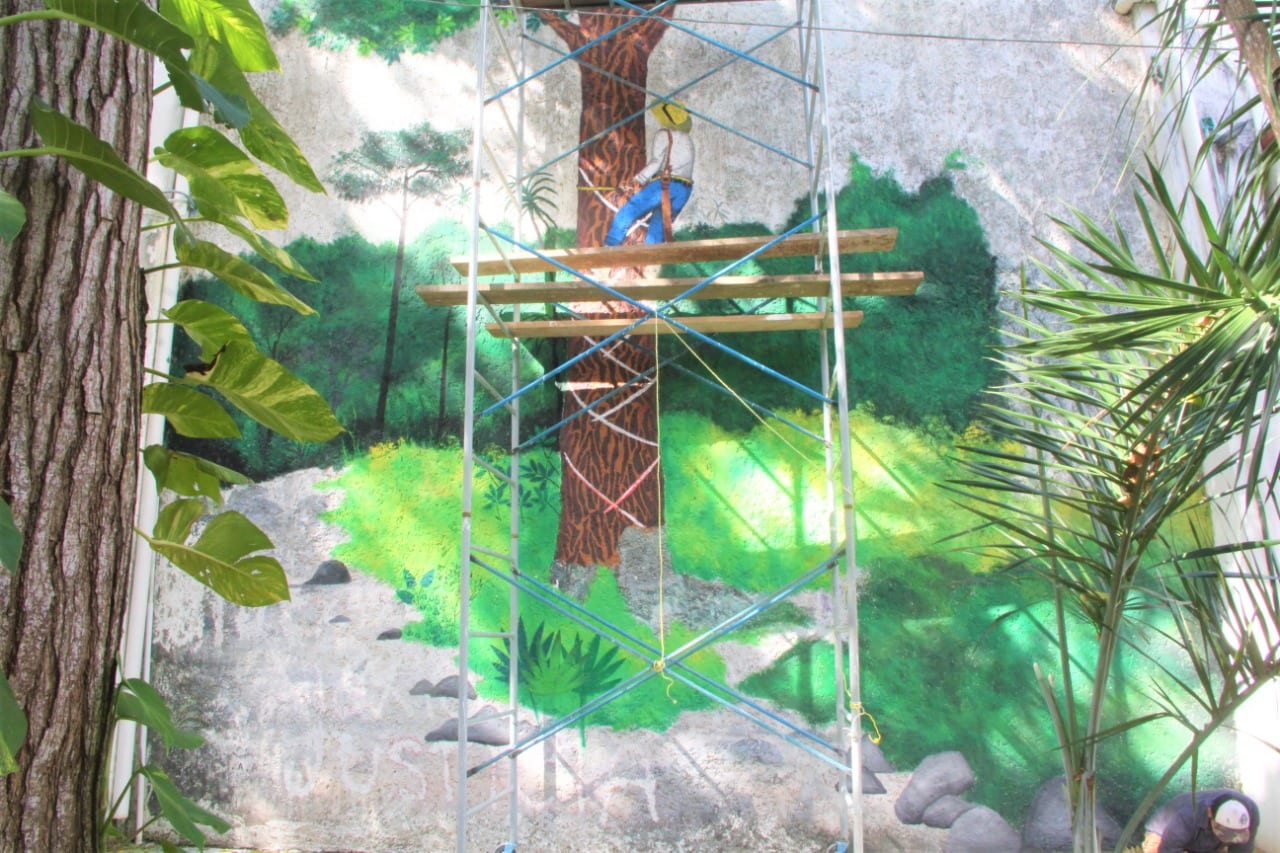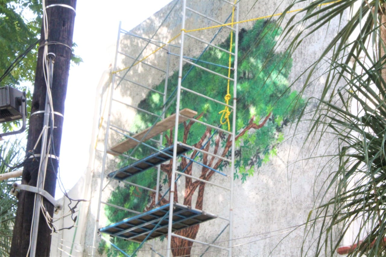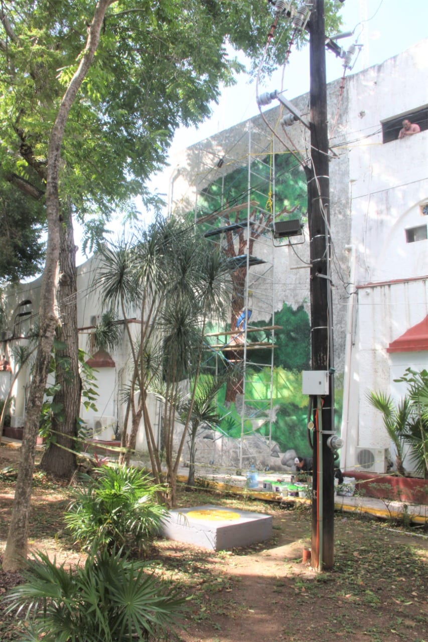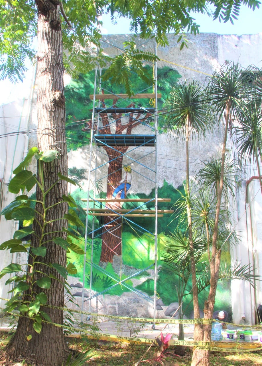 Cancún.- Desde hace una semana, un artista visual originario de Chiapas trabaja en la restauración del mural denominado “El Árbol Chiclero”, una obra considerada patrimonio de la ciudad, ubicada en la parte posterior del Palacio Municipal.