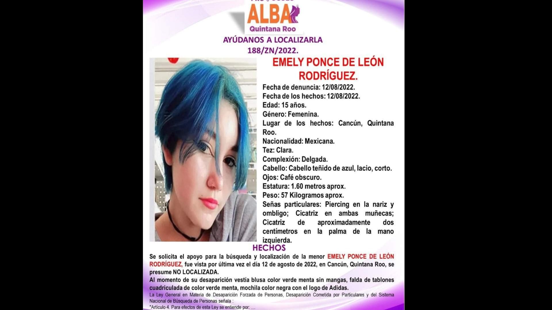 Cancún.- La Fiscalía General del Estado emitió esta tarde la ficha del protocolo Alba por Emely Ponce de León Rodríguez, joven de 15 años de edad que presuntamente fue raptada por unos asaltantes hoy en la Región 238 de esta ciudad.
