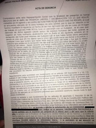 Lo primero que hice fue llamar a los seguridades que sólo me hicieron llenar una hoja narrando lo qué pasó y no hicieron NADA, me dirijí a recursos humanos y la jefa de ahí me dijo que no podía atenderme que hasta el día siguiente ¿Qué clase de persona no le brinda apoyo a una colaboradora en una situación así? Me quite y me fui a la recepción con la idea de qué tal vez me ayudaran con la llamada a la policía, lo cual la jefa de esa área me dijo ‘cualquier cosa que tengas que hacer lo tienes que hacer fuera del hotel’.”, contó.
