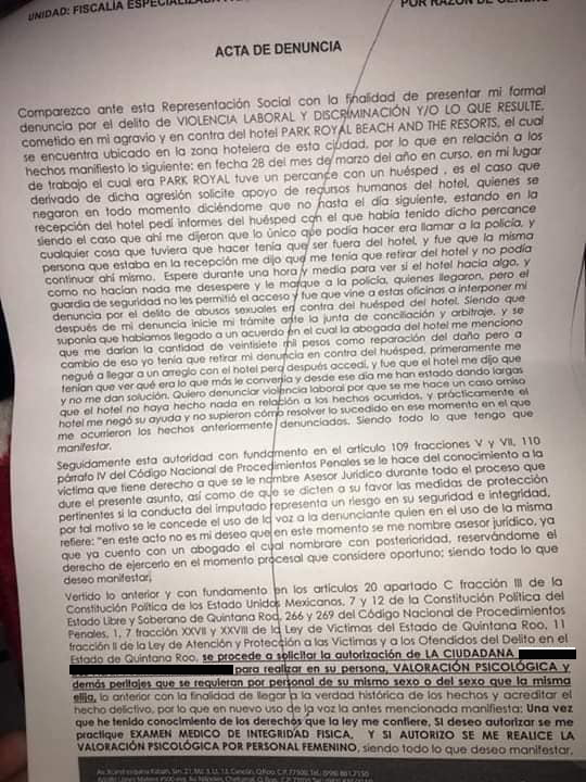 A través de las redes sociales, una empleada del hotel Royal Park denunció haber sufrido de abuso sexual por parte de un huésped el pasado 28 de marzo, y tras tratar de denunciar lo sucedido al personal del hotel, éste la ignoró, interrumpió las investigaciones de la policía, protegió al huésped y la despidió.