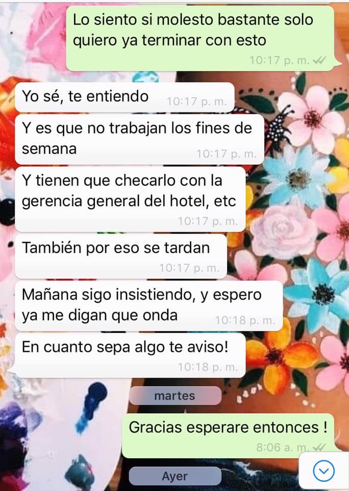“Al final fui a poner mi denuncia para el huésped que ni si quiera es de aquí, todavía tuve la pinche mente noble de hacer una conciliación con el hotel para llegar a un acuerdo con todo lo que sucedió, por toda la omisión que hicieron cuando pedí ayuda, la represente legal del hotel me informó que el hotel sólo quería pagarme $1800 a lo que conformaba mi finiquito y lo que merecía era muchísimo más, me negué aceptar esa cantidad y cuando por fin cedieron querían que yo quitara mi denuncia contra el huésped y sólo así me iban a pagar”.