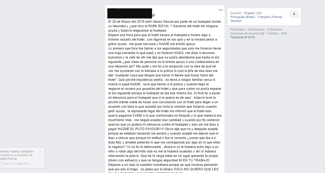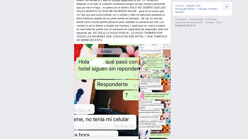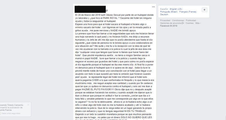 La víctima, de identidad reservada, relata en su publicación de Facebook, cómo buscó ayuda por todos los medios, con la seguridad del hotel, en la recepción y con recursos humanos y todos le dieron la espalda.
