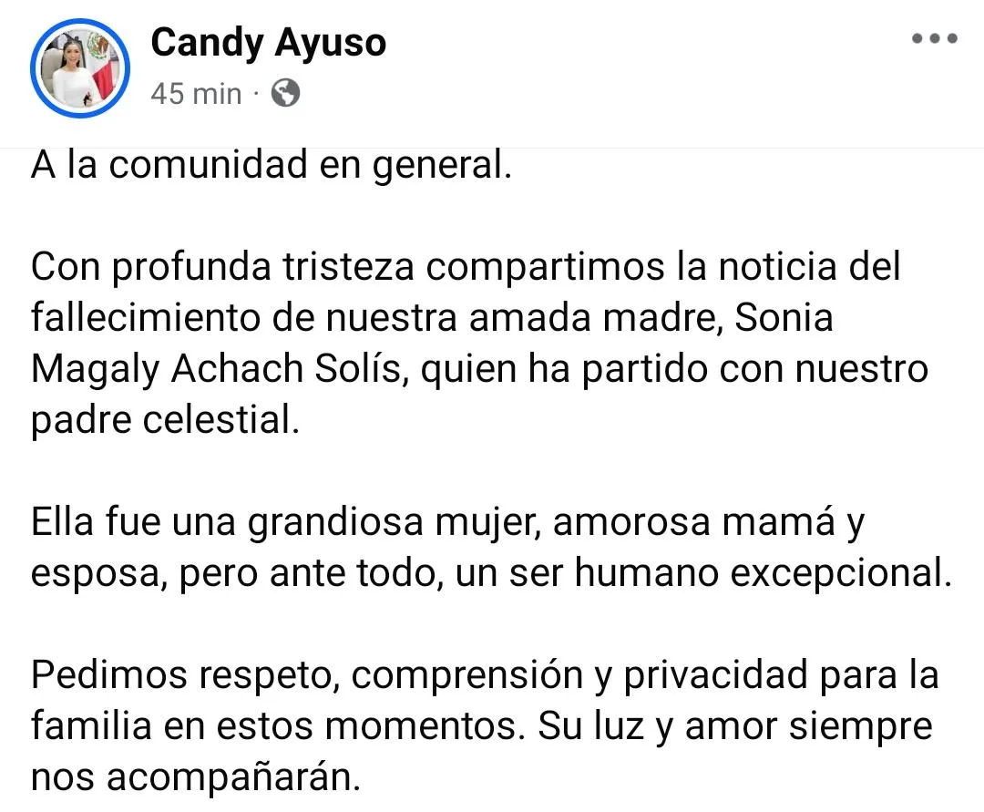 "Pedimos respeto, comprensión y privacidad para la familia en estos momentos. Su luz y amor siempre nos acompañarán. Agradecemos sus oraciones y muestras de cariño en este momento tan doloroso. Los detalles de las exequias se comunicarán más adelante. Muchas gracias. Atentamente. Familia Ayuso Achach. 10 de abril del 2026", finalizaba la publicación de "Candy" Ayuso sobre el deceso de su madre, Magaly Achach.