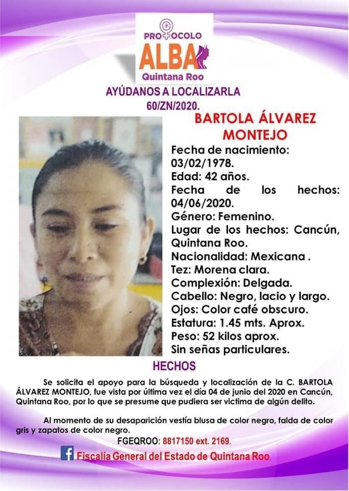 Cancún.- Una empleada doméstica, Bartola Álvarez Montejo, desapareció el pasado 4 de junio; tras la denuncia, se lanzó un protocolo ALBA; sin embargo, su cuerpo fue hallado ayer en el kilómetro cero de la Zona Hotelera, caso que la Fiscalía no quiso dar a conocer, tampoco emitiendo un volante indicando que esta mujer había sido hallada.