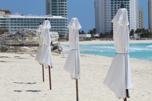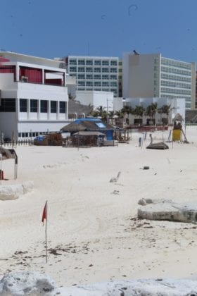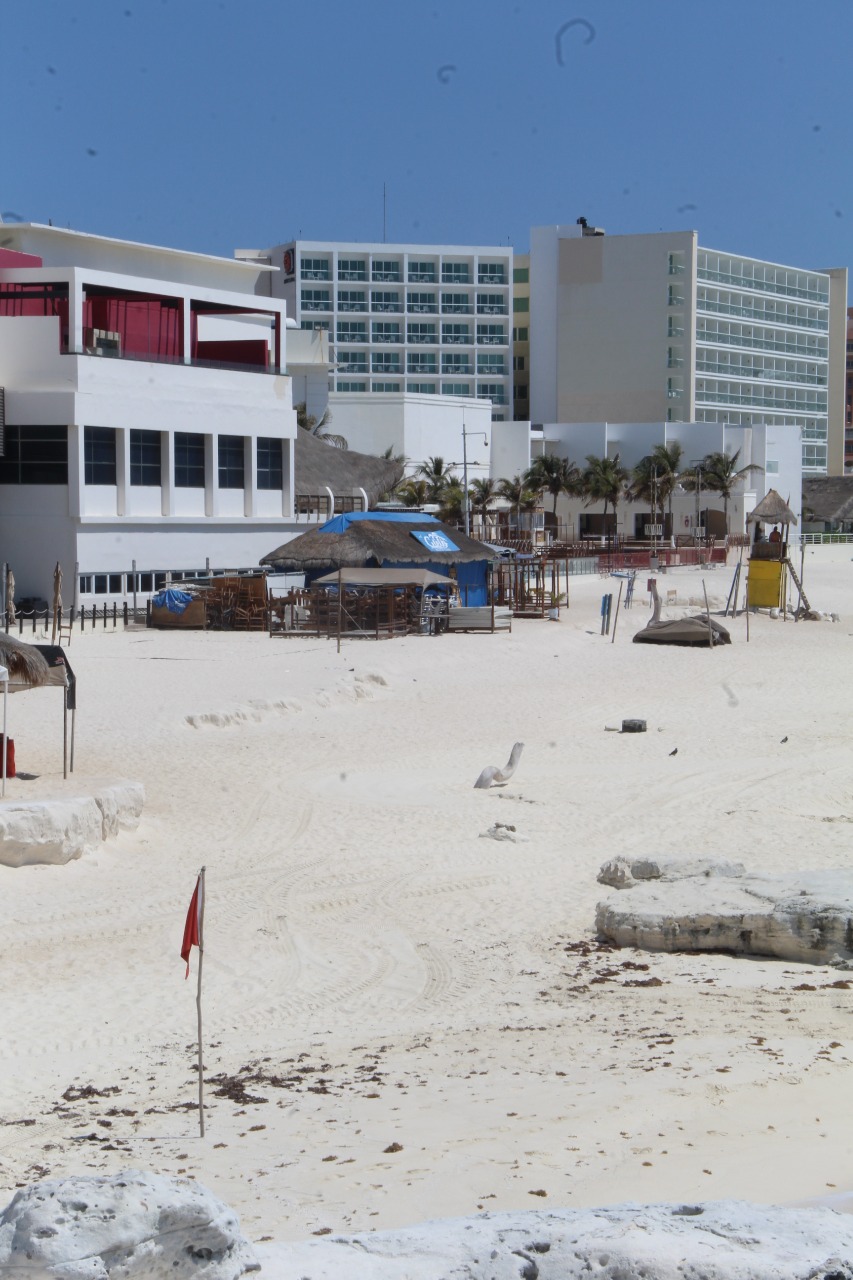 Limpias, amplias y libres de sargazo lucen las populares playas Gaviota Azul y Chac Mool, ubicadas en el corazón de la Zona Hotelera de Cancún, pero no hay grupos de familia ni camastros ni tiendas de masaje ni venta de bebidas ni música con animadores. Los clubes de playa, los puestos de venta están cerrados. No se ven vendedores ambulantes ni guardavidas y los únicos paseantes son contados, gente que ignora o no desea acatar las disposiciones oficiales, marcadas con banderas rojas.