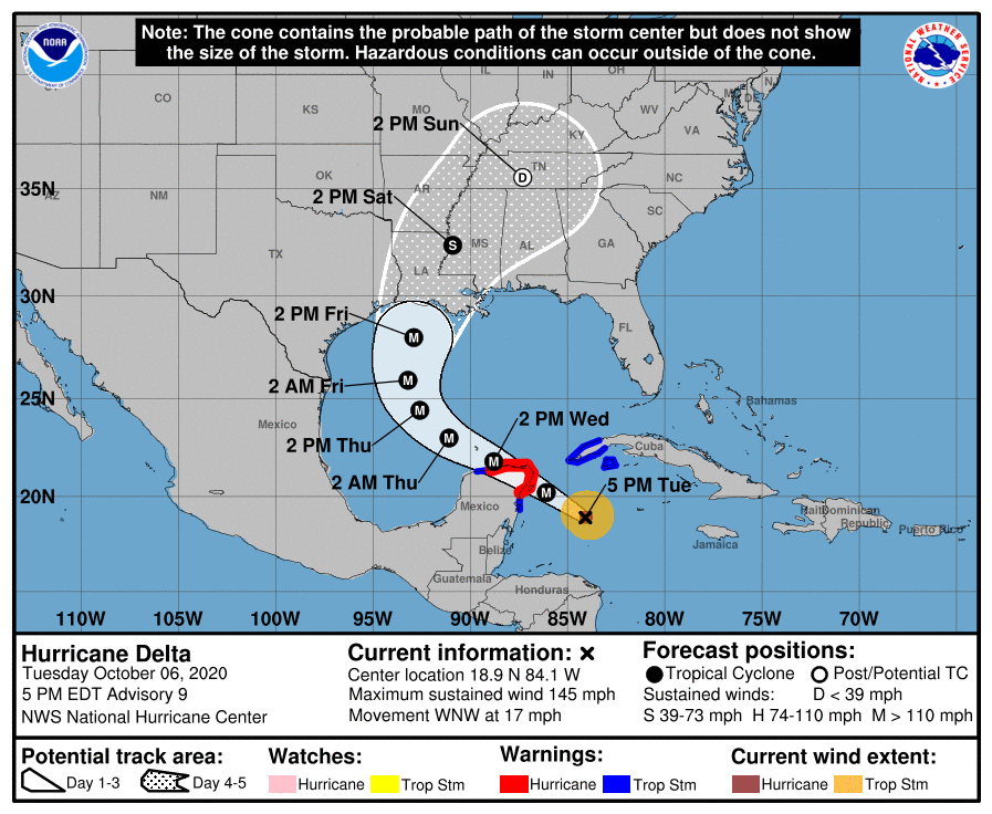 “Delta es un huracán categoría 4 en la Escala de Vientos de Huracanes Saffir-Simpson. Algún fortalecimiento adicional es posible antes que el centro llegue a la costa de la Península de Yucatán el miércoles. Aunque algún debilitamiento es probable cuando Delta se mueva sobre la Península de Yucatan”, se añade.