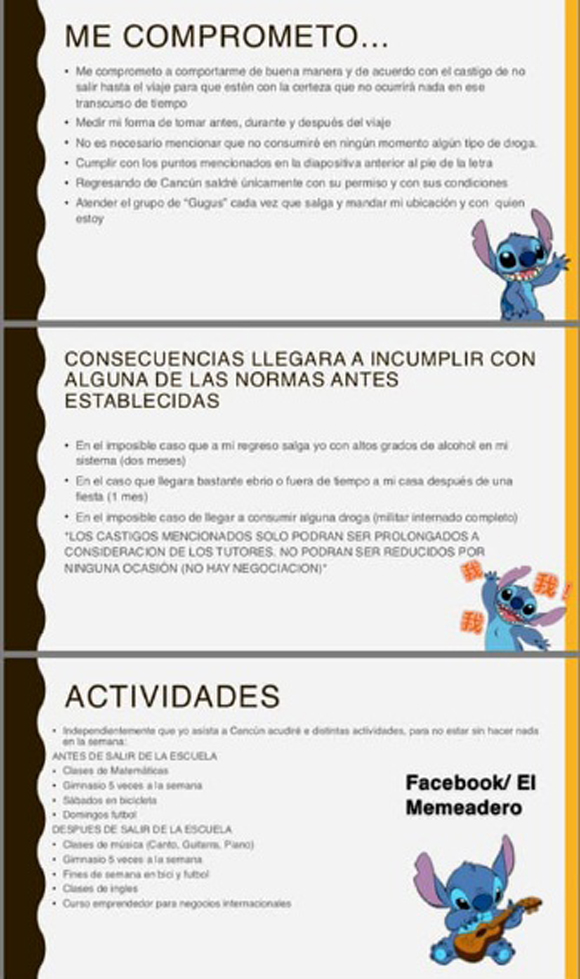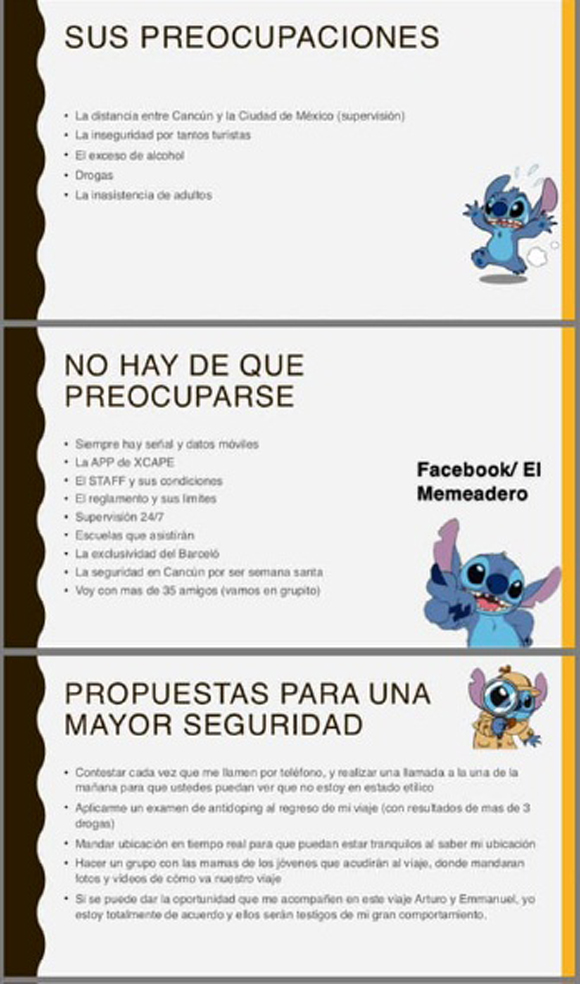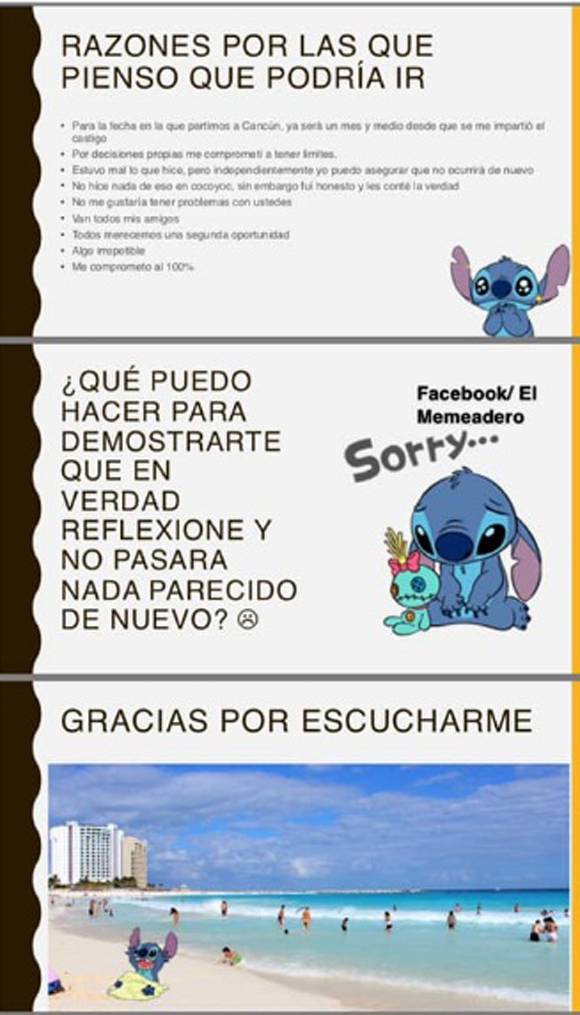 “Mi mejor amigo un mes antes de irnos a Cancún lo castigaron y le quitaron el permiso, hizo una presentación de PowerPoint para que lo dejaran ir (funcionó) y estoy impresionada de que en todo el tiempo que llevo con él en la prepa nunca hizo ninguna, ni para salvar el semestre”, explicó Daniela a través de Twitter.