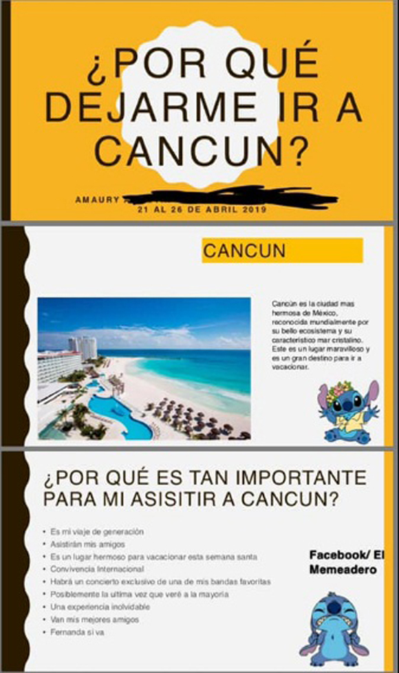 Sus ganas por conocer este bello paraíso turístico lo animaron a hacer varias diapositivas, lo que según su amiga, nunca hizo en la escuela. En la presentación explicaba sus ganas por conocer Cancún, la seguridad de la zona hotelera, sus compromisos y sus propuestas para mantener a sus padres tranquilos, presentación que fue un “éxito”.