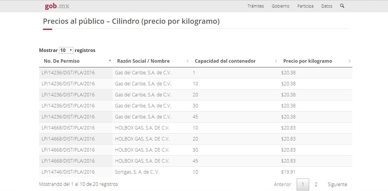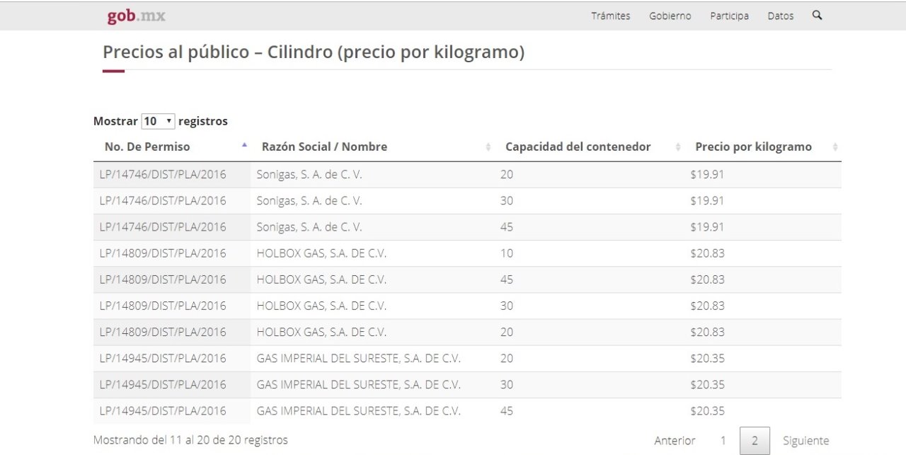 De acuerdo a la página de la dependencia (http://www.cre.gob.mx), Gas Caribe SA de CV y Holbox Gas SA de CV, tienen el litro de Gas LP en 20.38 en tanques de 10, 20, 30 y 45 litros, cuando en 2017 era de 16.72. En cambio, Sonigas SA de CV el precio del litro de gas licuado es de 19.91 pesos; y Gas Imperial del Sureste SA de CV su precio es de 20.35 pesos por litro.