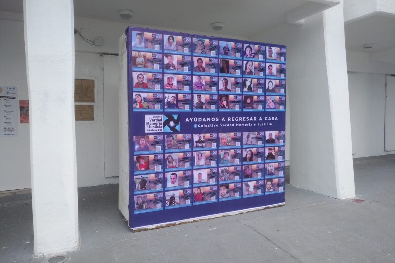 Madres de desaparecidos colocan mampara con imágenes de sus hijos en Cancún