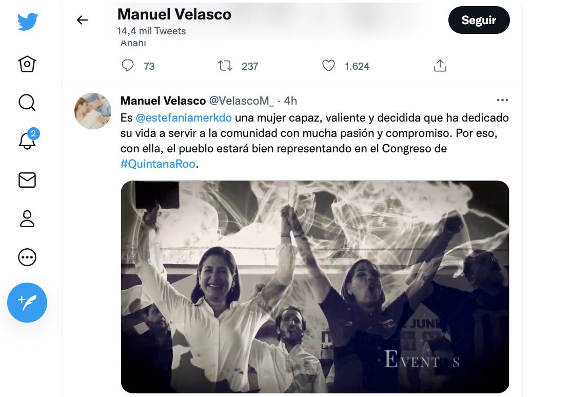 “Es Estefanía Mercado una mujer capaz, valiente y decidida que ha dedicado su vida a servir a la comunidad con mucha pasión y compromiso. Por eso, con ella, el pueblo estará bien representando en el Congreso de #QuintanaRoo”, escribió en su cuenta oficial el también ex gobernador de Chiapas.