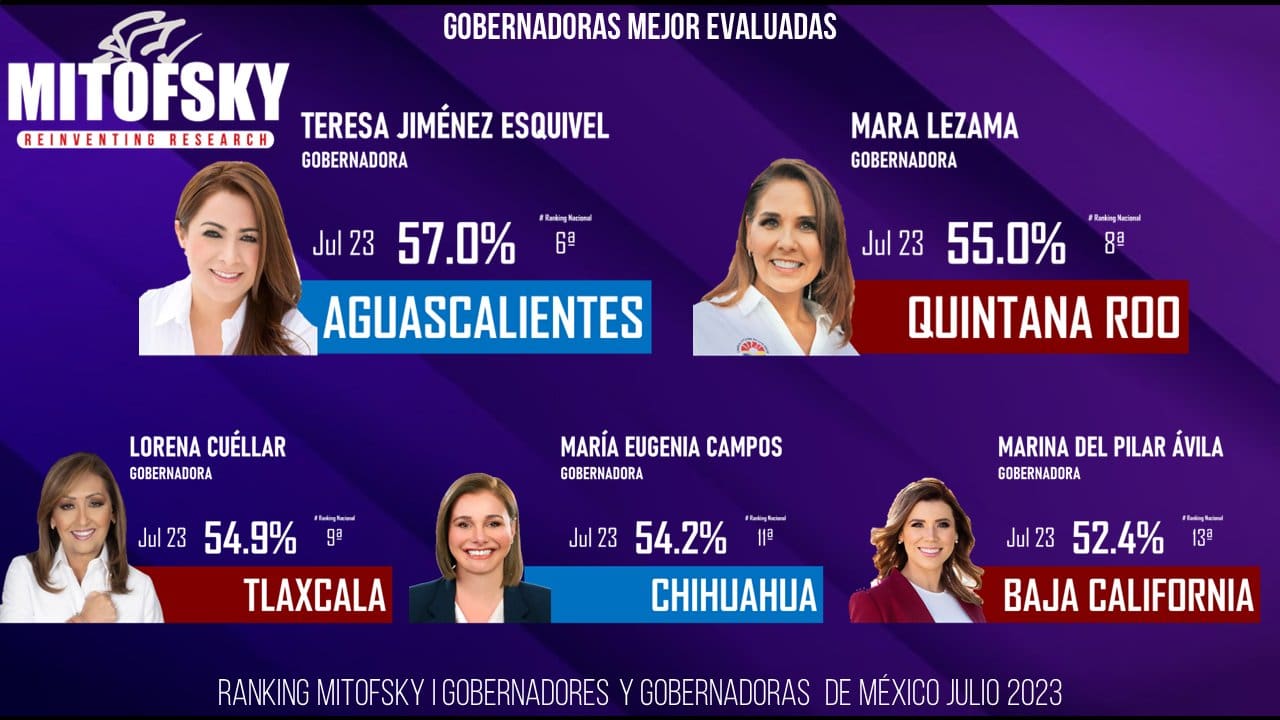La gobernadora de Quintana Roo, Mara Lezama Espinosa es la segunda gobernadora con mayor aprobación a nivel nacional, de acuerdo con el ranking de la empresa Consulta Mitofsky correspondiente al mes de julio de 2023.