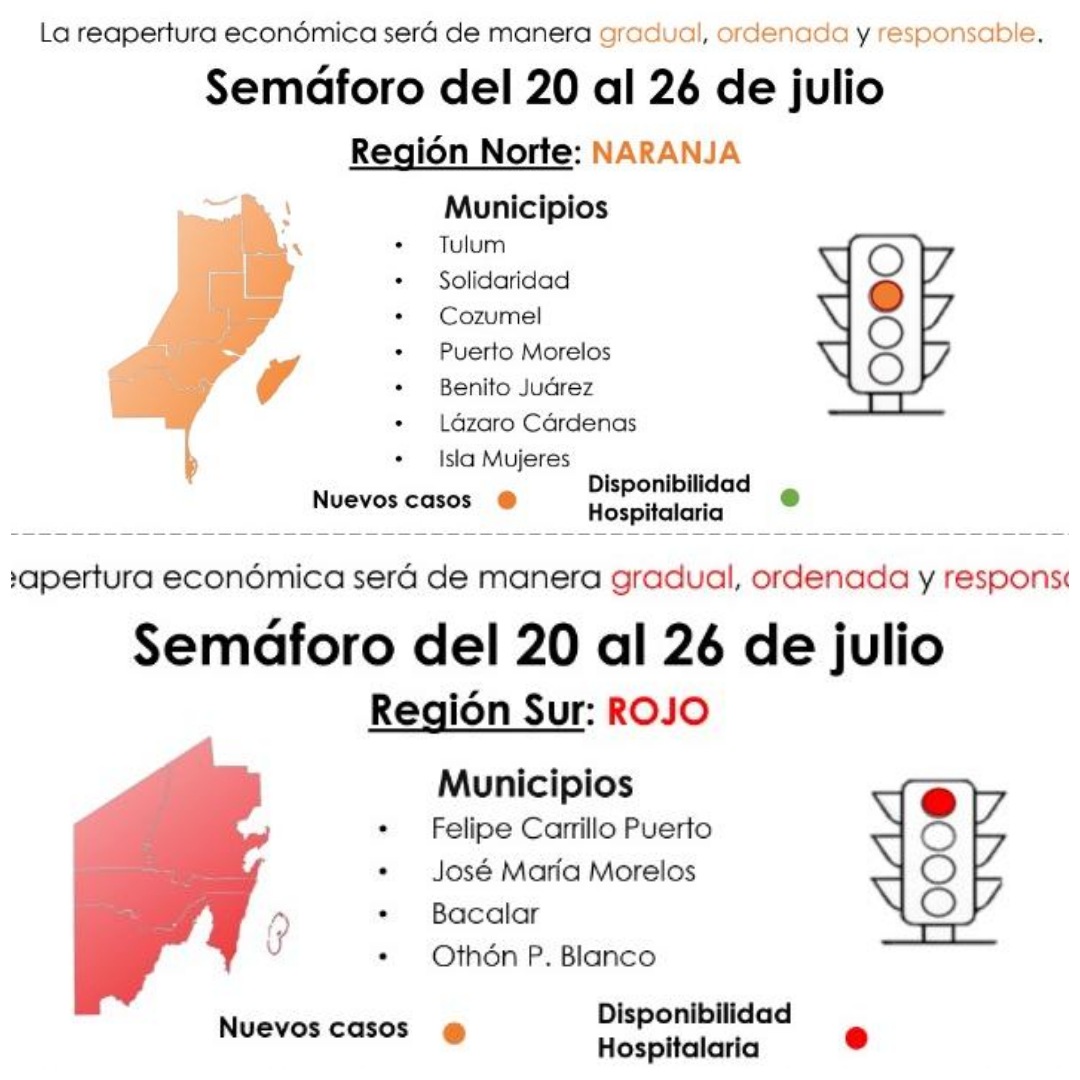 Por otra parte, el gobernador de Quintana Roo, Carlos Joaquín González, publicó en redes sociales el estatus que guarda el semáforo Covid para el estado, indicando que es rojo para la zona sur, y naranja para la zona norte.