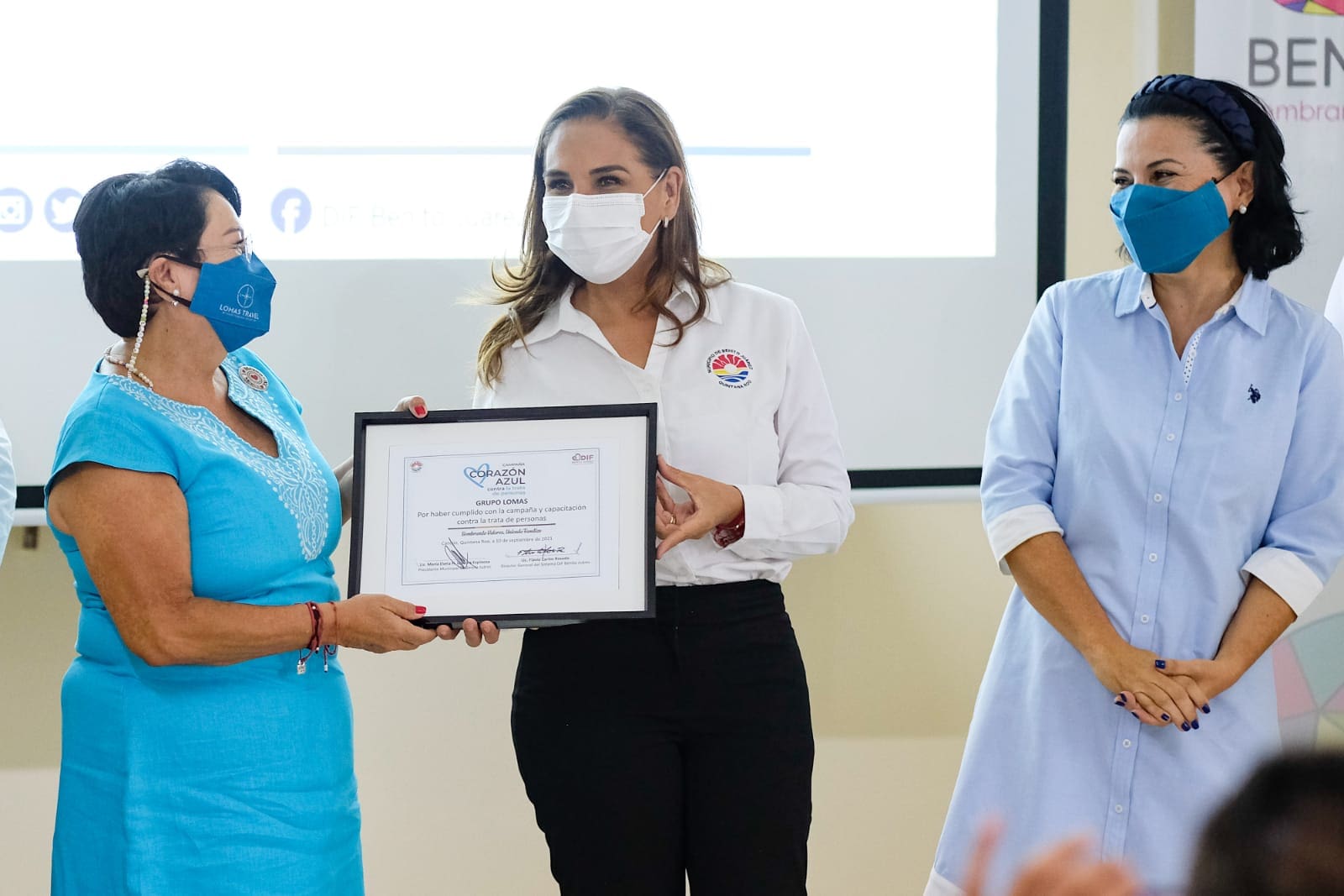Cancún, Q.R., a 11 de septiembre de 2021.- Como parte de las acciones que ha emprendido el Ayuntamiento de Benito Juárez para combatir el delito de Trata de Personas, la Presidenta Municipal Mara Lezama encabezó la entrega del distintivo “Corazón Azul” al Grupo Lomas Travel, empresa comprometida en esta lucha.